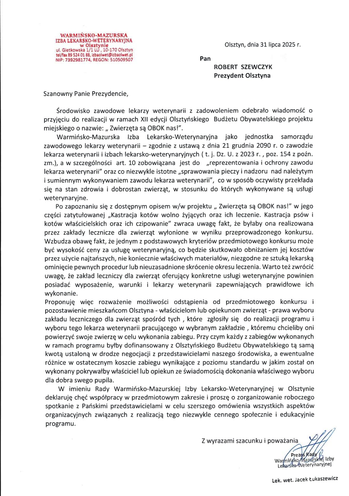 Warmińsko-Mazurska Izba Lekarsko-Weterynaryjna w Olsztynie Pismo do Prezydenta Olsztyna dot. OBO